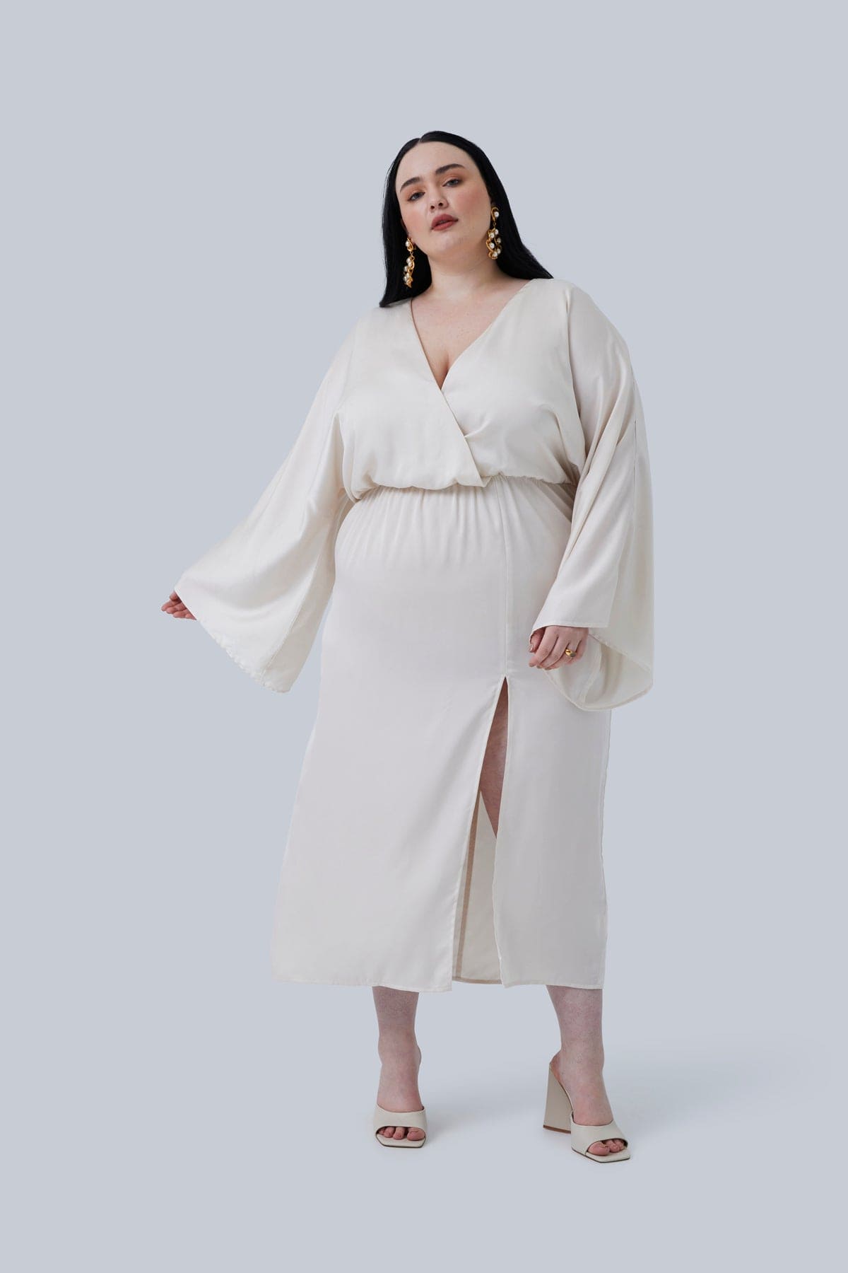 - Dolman Kimono Sleeve, Surplice Bodice Midi Dress with Thigh High Slit
